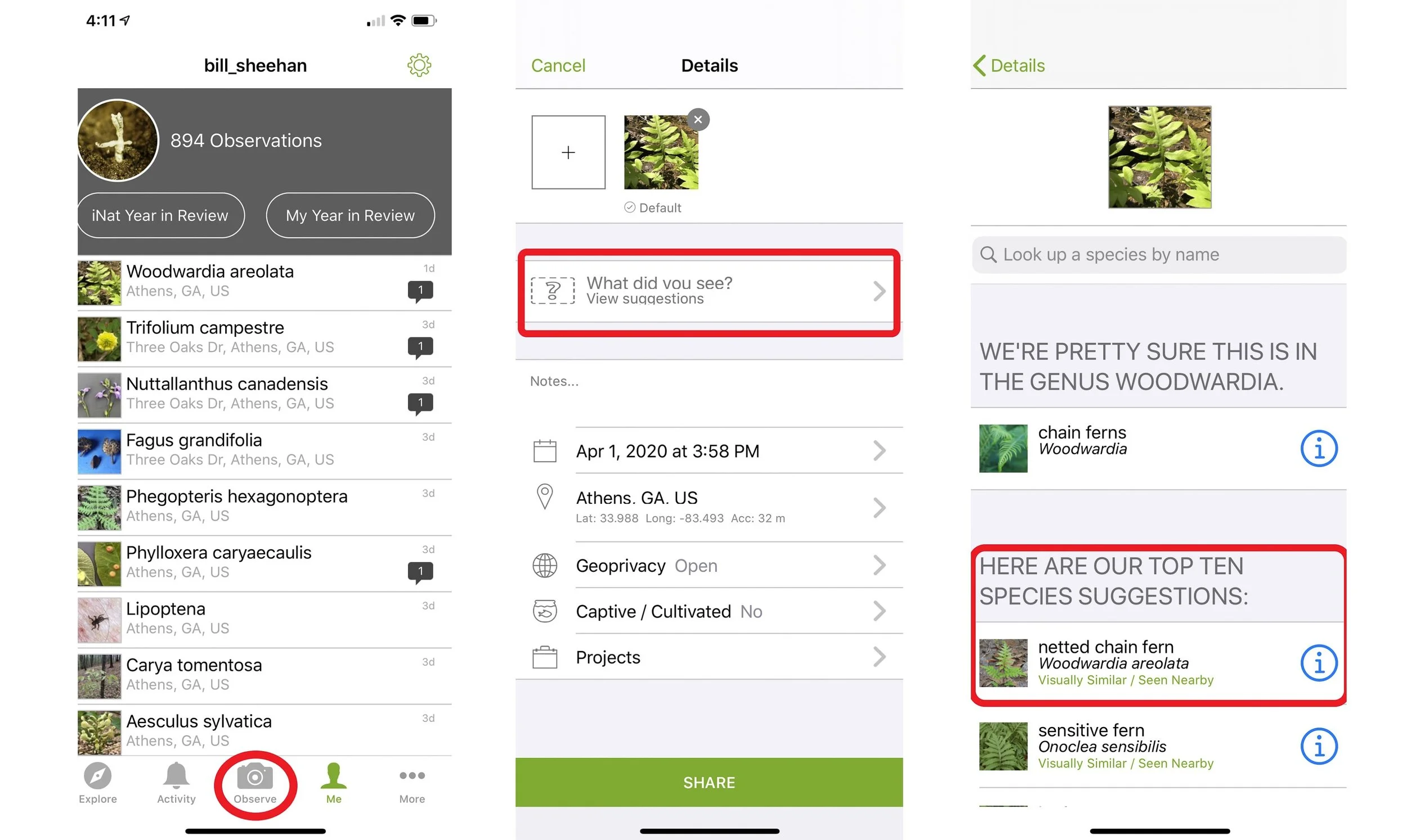 iNat is pretty good at putting names on common things if the photos are clear. But there’s an art to taking good nature photos with a smart phone. Take several photos for each organism of aspects likely to be important for identification; take at least a general shot and a close-up. You can get special apps ($3) and lenses ($20) to do amazing close-up photography, which is usually helpful for small critters like insects. Most photo apps these days also let you crop and otherwise tweak your photos before posting to iNat.