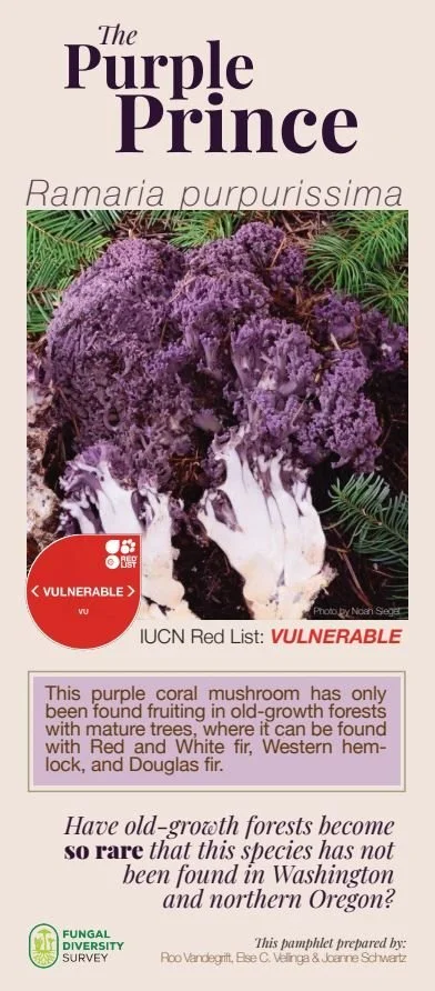 The West Coast Rare Fungi Challenge highlighted ten rare species during its six-month pilot period. An educational pamphlet was created for each species. This image is the front cover of the Ramaria purpurissima (one of the three species yet to be observed during the Challenge) pamphlet, prepared by Roo Vandegrift, Else C. Velinga, and Joanne Schwartz. View the Challenge pamphlets here.
