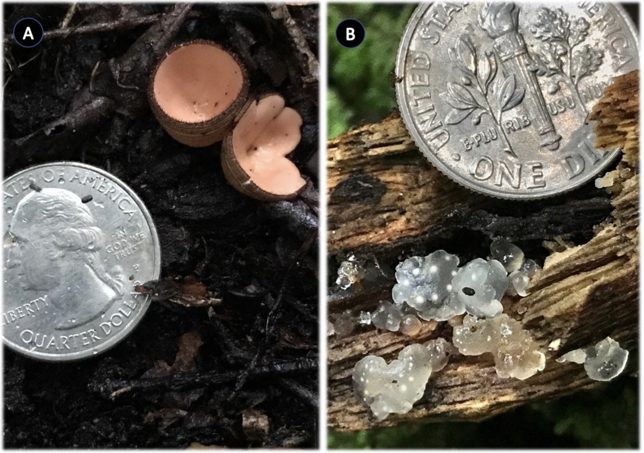 A. Geodina guanacastensis, with a quarter for scale. B. Myxarium nucleatum, with a dime for scale.