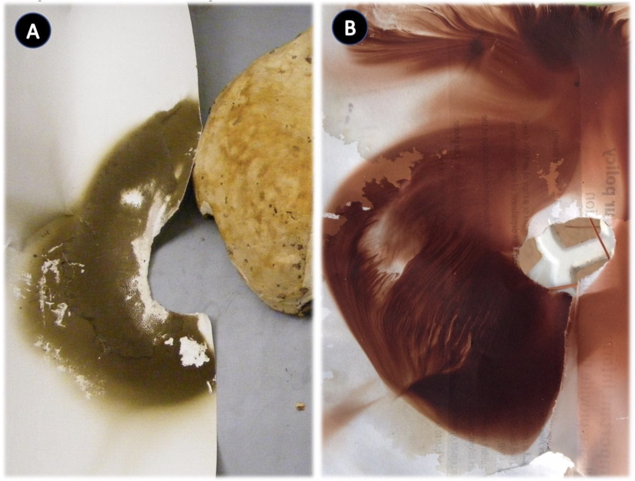 A. Boletus atkinsonii, a dark olive spore print. B. Volvariella bombycina, a pink-brown spore print.